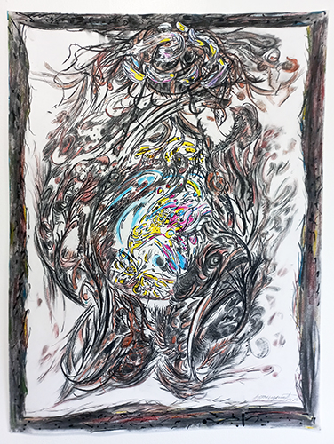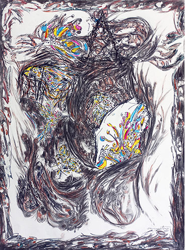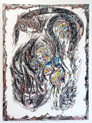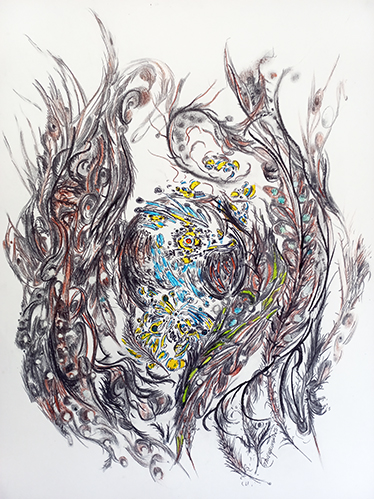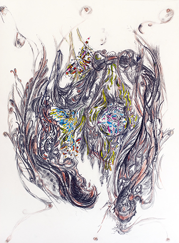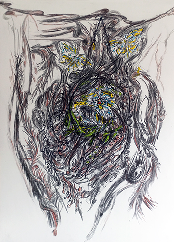 Nids, 2026 - Fusain, graphite, pierre noire, craie, marqueur, acrylique sur papier, 80 x 60 cm.